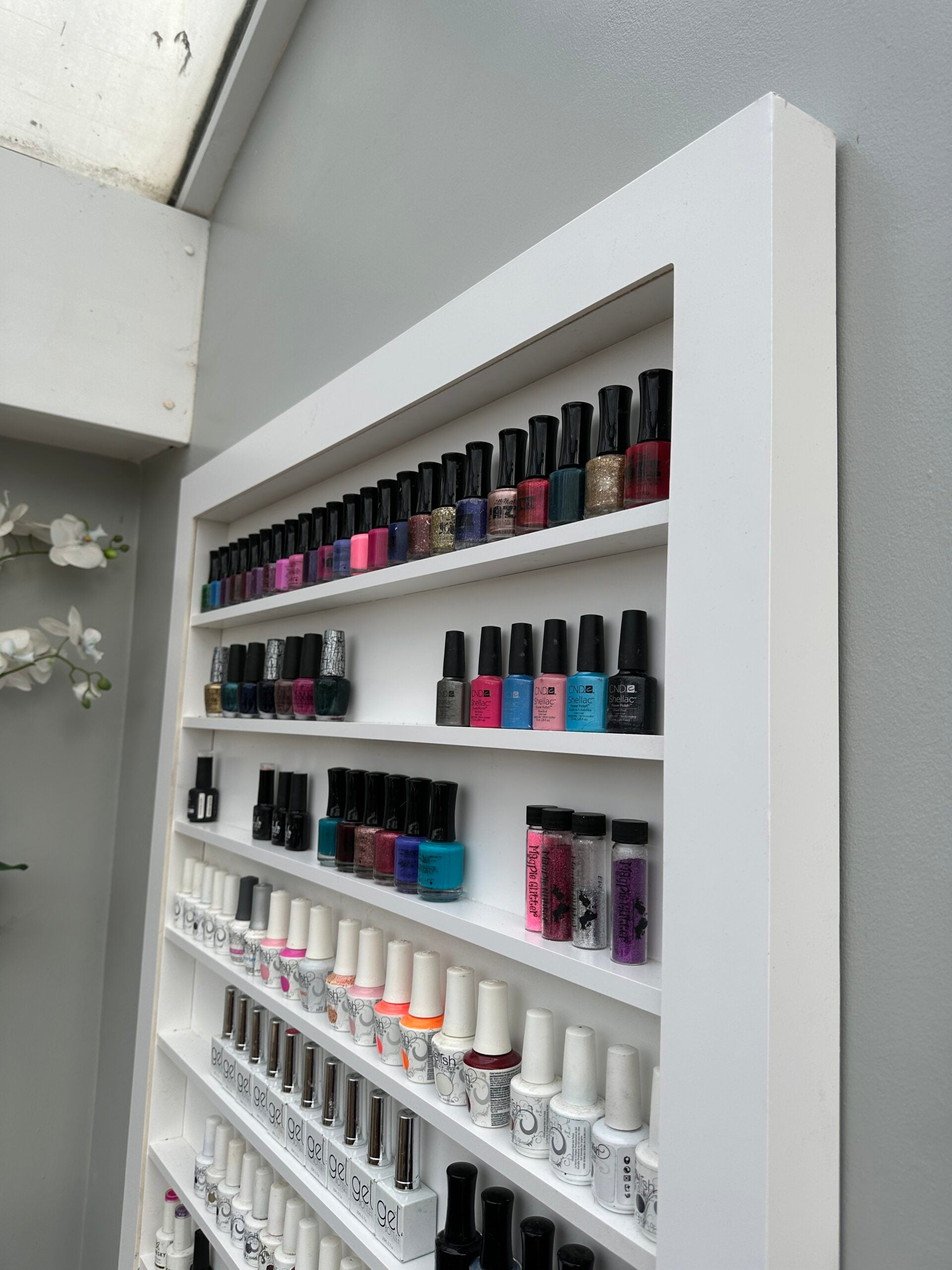Introducing the Eco-Luxe line of nail polish display frames, a revolutionary solution for nail salons seeking elegant storage options. Among these, the 'Eco-Lux Portrait' edition stands out, boasting a robust and sleek design. It comes complete with a comprehensive installation guide to facilitate effortless integration onto your salon walls.